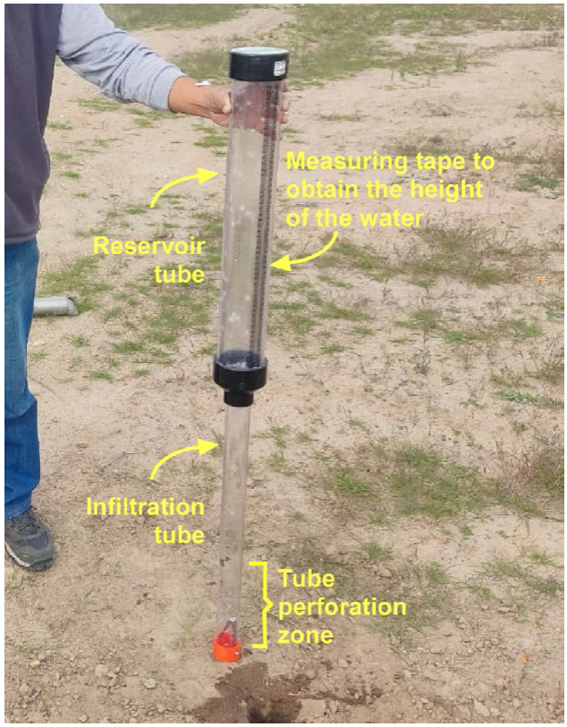 The primary data obtained during the field test are the variation of the water level in the permeameter reservoir tube (upper tube shown in Figure 4), and the elapsed time, because once the permeameter is embedded in the hole, the water begins to infiltrate into the subsoil at a flow rate that mainly depends on its hydraulic conductivity. At the beginning of the test, the infiltration rate is usually variable but becomes constant after a few minutes. At this time, the following expression can be applied (Reynolds, 1993):