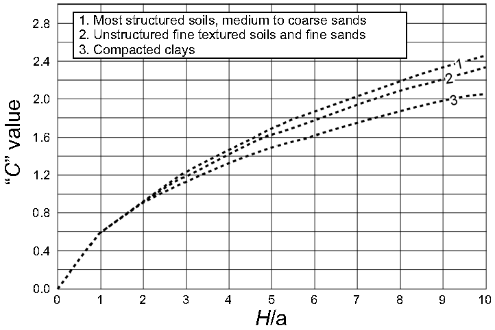 Figure 5 Graph to obtain the values of the parameter C as a function of the parameters H and a, according to (Reynolds, 1993). Each curve corresponds to a type of soil as explained in the figure.