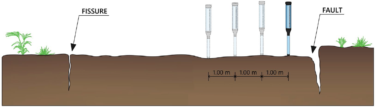 For this investigation, 33 tests with the permeameter were carried out, separated on the surface by one meter each other and in a profile line perpendicular to the two discontinuities as shown in the diagram of Figure 6.