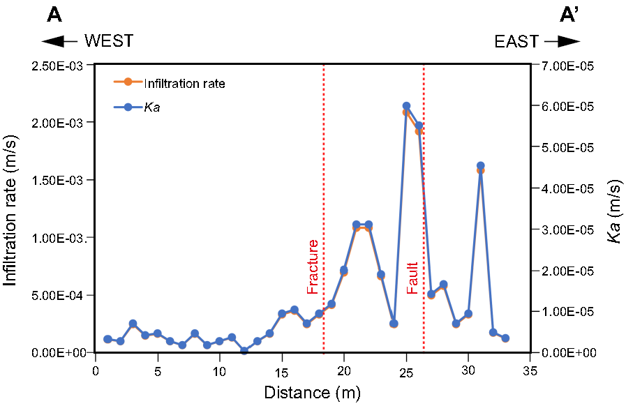 The 33 permeability tests in the general profile (A-A’) performed with the Pask permeameter allowed to obtain varied data on both infiltration rate and hydraulic conductivity, as shown in Table 2. For the first parameter, the results yielded values of a maximum of 12.5 cm/min (2.08E-03 m/s), which was obtained at a distance under two meters from the fault plane, while the smallest measurement obtained was 0.1 cm/min (1.67E-05 m/s). The average infiltration rate for the overall profile was 2.68 cm/min (4.46E-04 m/s), although the geometric mean was 1.55 cm/min (2.58E-04 m/s). On the other hand, the hydraulic conductivity (Ka) data varied by two orders of magnitude along the profile ranging from a maximum of 5.99E-05 m/s to a minimum of 4.79E-07 m/s, with a geometric mean of 7.42E-06 m/s and an average of 1.28E-05 m/s. The significant differences in the data for each parameter are indicative of the hydraulic differences between the unaffected soil and the soil affected by the discontinuities. There may be implicit errors associated with the measurements, but we believe that these potential errors do not significantly affect the final results.