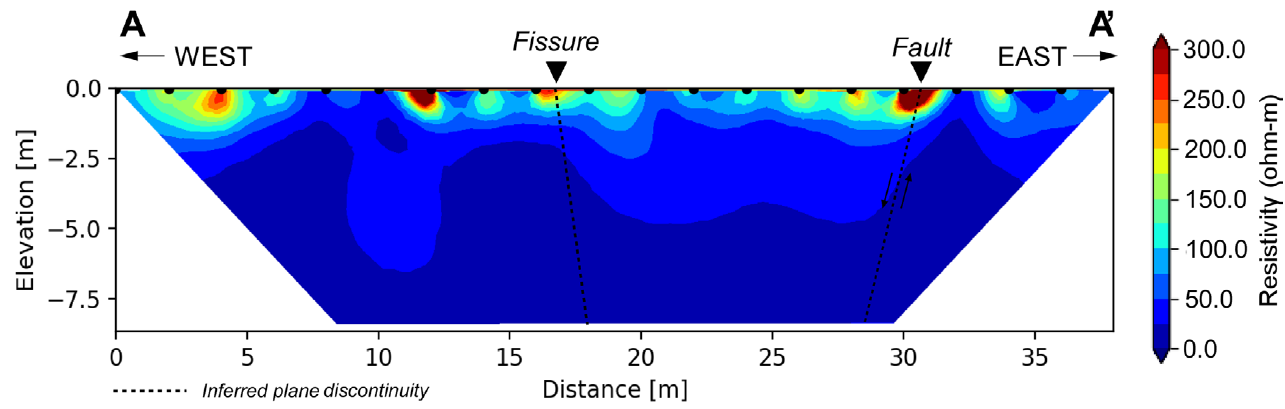 As mentioned above, a general ERT profile was applied to characterize the study area and to better understand the initial conditions of the local subsoil in response to an electric current (line A-A’). As can be seen in Figure 8, the resulting profile suggests that both discontinuities have almost vertical displacement. The areas of low resistivity, lower than 25 Ω·m, could be related to a number of features, such as the presence of clay, high compaction, etc. They could also be related to high moisture retained by the soil, for example, the one closest to the fault plane, which is observed to a depth of two meters. The areas with high resistivity, more than 300 Ω·m, are observed closer to the surface and could be associated with air, for example in the location of the fault. These areas of high resistivity could also be associated with compacted soil due to the presence of dirt roads and pedestrian paths.