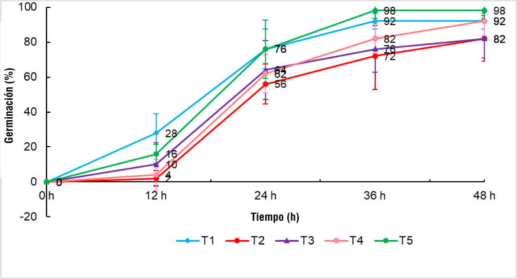 Figura 4 Curva de germinación de semillas de maíz tratadas con diferentes concentraciones de partículas yodadas. T1 = testigo (agua destilada); T2 = 5 mg∙L-1; T3 = 10 mg∙L-1; T4 = 20 mg∙L-1; T5 = 50 mg∙L-1.