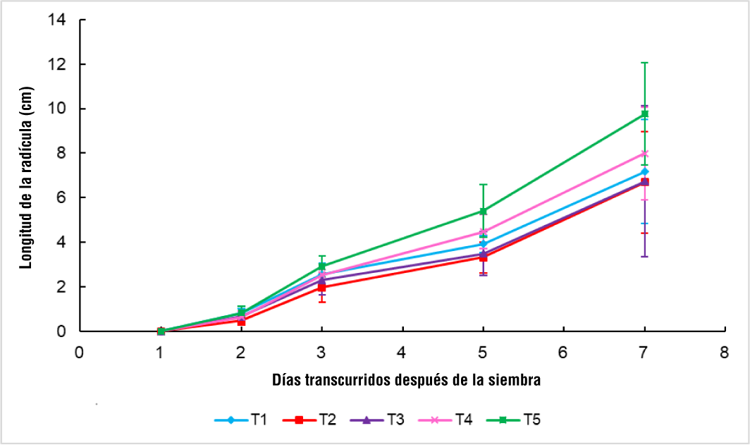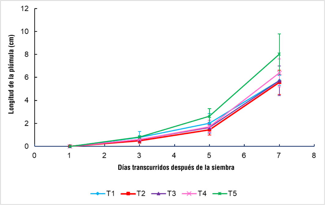 En cuanto a la curva de crecimiento del sistema radicular, la emergencia inició al segundo día de la siembra en todos los tratamientos, y el crecimiento de la raíz principal progresó continuamente a lo largo de su desarrollo. Al analizar el patrón de crecimiento de esta variable (Figura 5), se observó un pequeño incremento en el tercer y cuarto día, y para el quinto día el patrón de crecimiento aumentó considerablemente. De manera similar, la plúmula (Figura 6) tuvo lugar al tercer día de la siembra, e incrementó la altura de manera acelerada a partir del quinto día en todos los tratamientos. En ambas variables, el tratamiento cinco presentó un mejor desarrollo, incluyendo al testigo.