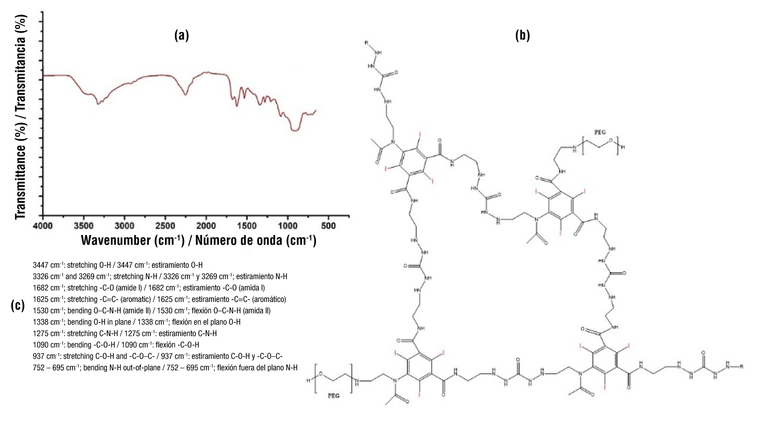Figura 1 a) Espectroscopía infrarroja de las partículas yodadas, b) estructura polimérica con grupos triyodobenzeno y grupos funcionales característicos del monómero utilizado (iohexol), así como los grupos hidroxilo, amida y grupos aromáticos (Fuente: Hainfeld et al. [2018] ) y c) distribución de marcadores importantes en el espectro.