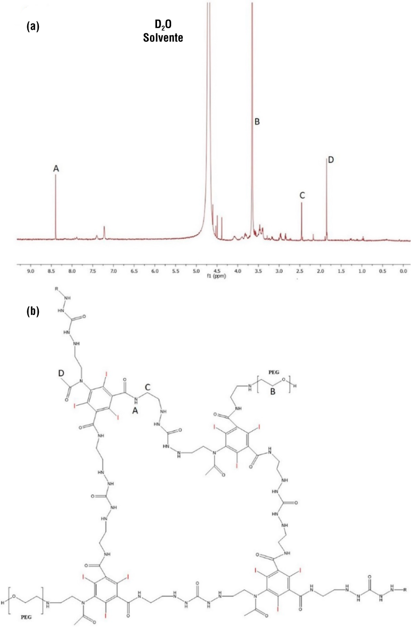 Figura 2 a) Espectroscopía de resonancia magnética nuclear de protones de las partículas yodadas y b) estructura polimérica con grupos triyodobenzeno y grupos funcionales característicos conforme al monómero utilizado (iohexol) (Fuente: Hainfeld et al. [2018] ).