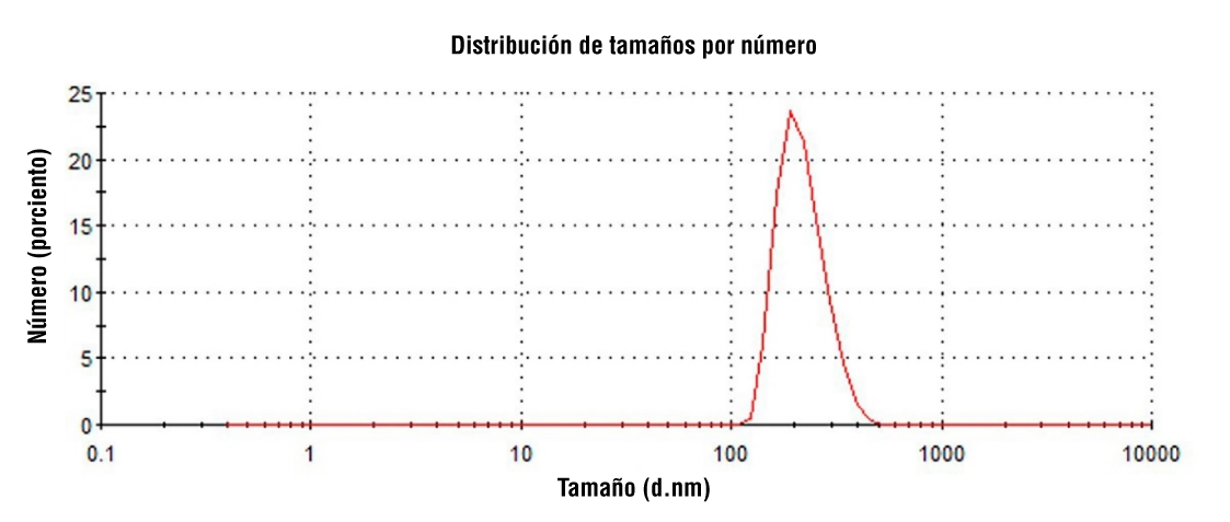 La Figura 3 muestra la curva de distribución de los tamaños de las partículas determinados por dispersión de luz dinámica. El diámetro promedio en número (Dn) de las PI fue de 217 nm, con polidispersión de 0.278, razón por la cual las partículas se clasificaron como submicrométricas. La forma de la curva es monomodal y estrecha.