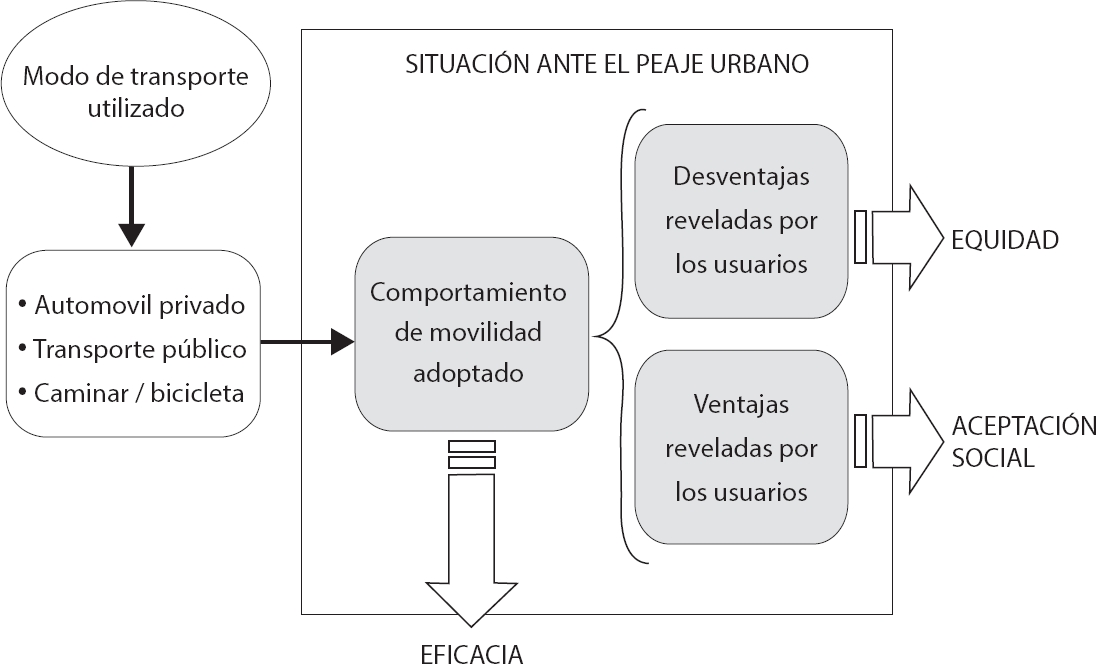 La efectividad social percibida sobre la tarificación vial por parte de los usuarios, la evaluación de las ventajas y desventajas de movilidad esperadas (Gärling et al., 2008) y el análisis de la equidad social que aportaría el peaje urbano antes de su implantación constituyen factores determinantes que influyen en la aceptabilidad social de la medida (Schade y Schlag, 2003; Zheng et al., 2014). Además de los factores mencionados, es necesario abordar de forma preliminar dos aspectos que son trascendentales para garantizar la viabilidad y aceptabilidad social a priori de un peaje urbano, como, en primer lugar, la percepción social del problema de movilidad que se pretende solucionar como factor necesario para enfocar la política de tarificación vial con éxito, ya que no es lo mismo una política de peaje urbano inspirada en la reducción de la congestión (Zheng et al., 2014), cuyo objetivo consiste en el establecimiento de una tarifa variable orientada a reducir los niveles de motorización entrantes en el área protegida, como es el caso de Singapur, que una política de peaje enfocada sobre la reducción de la contaminación (Aldy et al., 2010; Schwanen et al., 2011; Sterner y Coria, 2012; Ferraro y Miranda, 2013), cuyo objetivo sería el establecimiento de una tarifa de peaje variable en función de los niveles de contaminación registrados, como parece ser el caso del peaje aplicado en Estocolmo (Pozueta, 2008). Desde esta perspectiva, la necesidad de implantar un peaje urbano dotado de un alto nivel de aceptabilidad social, a priori, supone identificar socialmente si la principal preocupación de la ciudadanía se sitúa en una mejora de los tiempos de desplazamiento o en la reducción del costo de horas de trabajo perdidas y el absentismo por parte del colectivo empresarial como consecuencia de atascos circulatorios continuados, —lo que induciría a la implantación de un peaje anticongestión que permitiera mejorar la velocidad de circulación—, o bien, si la principal preocupación social es el nivel de contaminación existente en el centro urbano y su entorno, esto induciría a aplicar un peaje urbano con un mayor enfoque en la mejora del medio ambiente. Según el Informe Rocol (2000), el caso del peaje londinense —como caso similar en el que se inspira el peaje urbano que se plantea en la presente investigación—, pone de manifiesto que el alto nivel de aceptación social se encuentra en el hecho de que 90 por ciento de los ciudadanos revelan una elevada preocupación tanto por la pérdida de tiempo en sus desplazamientos como por la contaminación atmosférica de la ciudad; razones por las que 41 por ciento consideraba que la tarifa de peaje supondría una adecuada fórmula para recaudar fondos destinados a una mejora del transporte público como pieza clave para contribuir a la consecución de ambos objetivos; tanto una mejora de la velocidad de circulación como un mejora medioambiental.