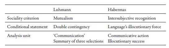 In the case of Luhmann, such definition focuses on the synthetic model of communication. This supposes a criterion of sociality based on mutualism, a conditional statement on the basis of the double contingency and the analysis unit segmented on the concept of communication as a summary of three selections. In Habermas’ case, this definition focuses on the model of generation of understanding of communicative action. This supposes a criterion of sociality supported on intersubjective recognition, a conditional statement based on the illocutionary force of language and the analysis unit segmented in the concept of communicative action as illocutionary success.
