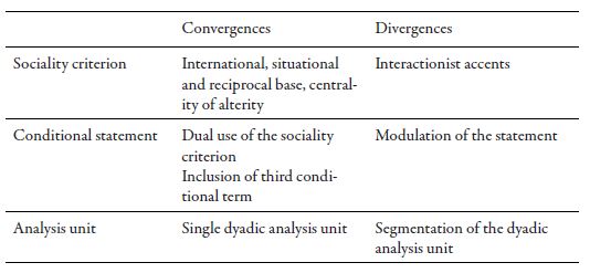 Our hypothesis is that the authors concur in criteria on sociality, conditional statements and analysis units, because of the common assumption of a markedly dyadic sociologic schema at the three levels, while they widely diverge on the segmentation of such analysis units.