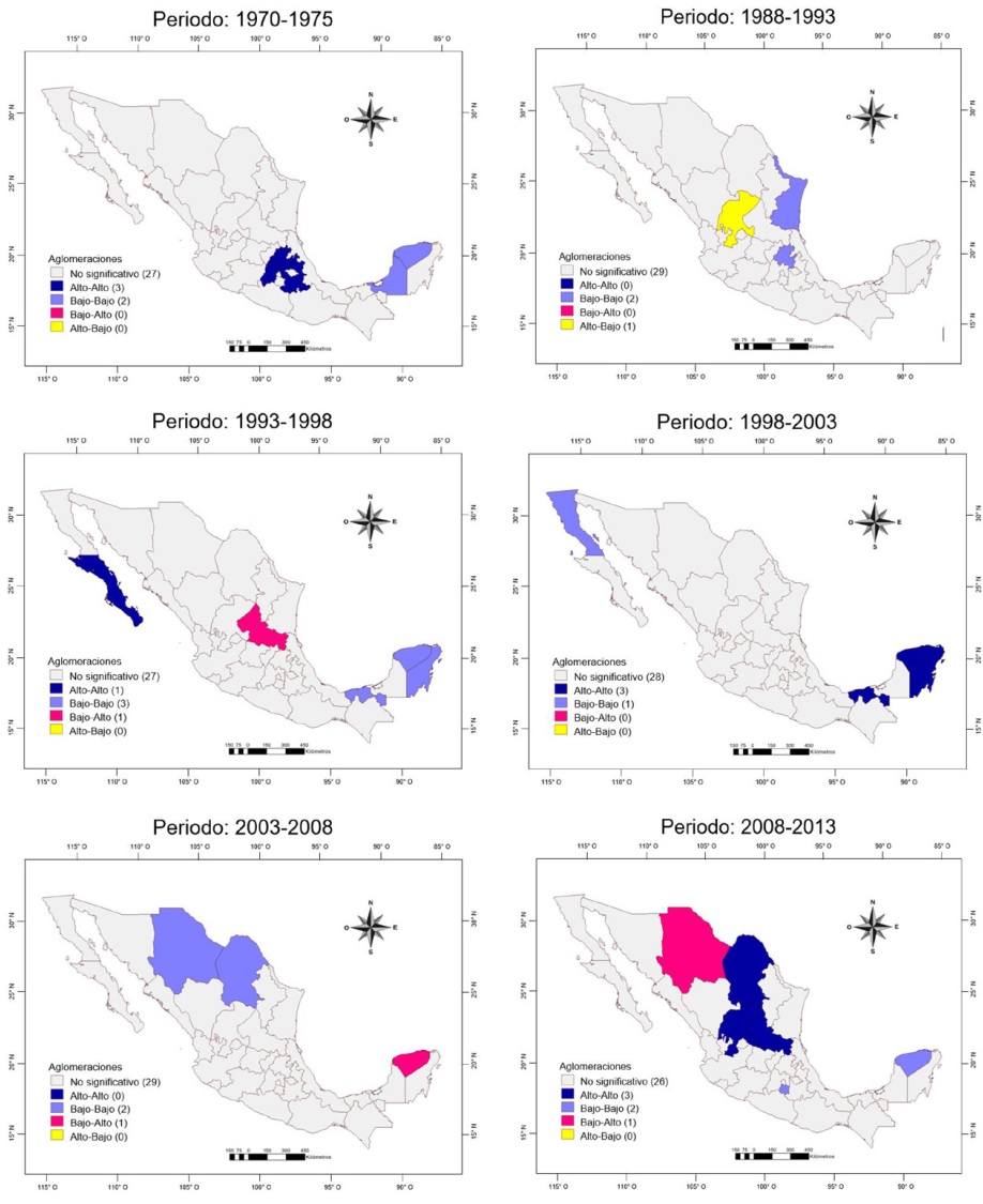 El empleo en la manufactura mostró una tendencia de aglomeración que inició en los estados del centro, centro-occidente y, en menor medida, del norte de México, donde las correlaciones fueron entre entidades con mayor crecimiento (alto-alto); hasta mediados de la década de los ochenta estas correlaciones se identificaron en algunos estados del sur del país, aunque ya para los años noventa fueron pocas y de tipo bajo-bajo. A partir de la completa apertura comercial es marcada la formación de aglomeraciones en los estados de la frontera norte con correlaciones alto-alto.