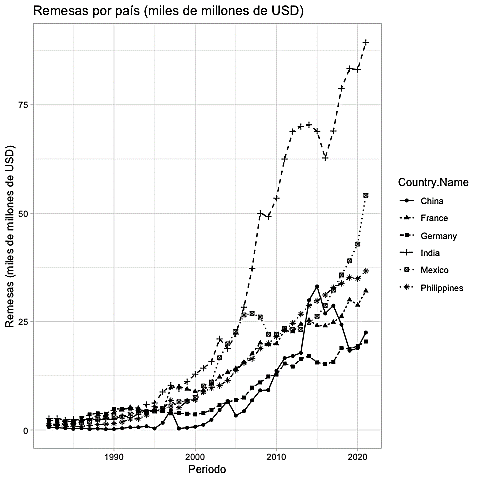 La gráfica 1 ilustra la naturaleza de las remesas, mostrando los países que más las han recibido en el mundo desde 1982 hasta 2020, en miles de millones de dólares.