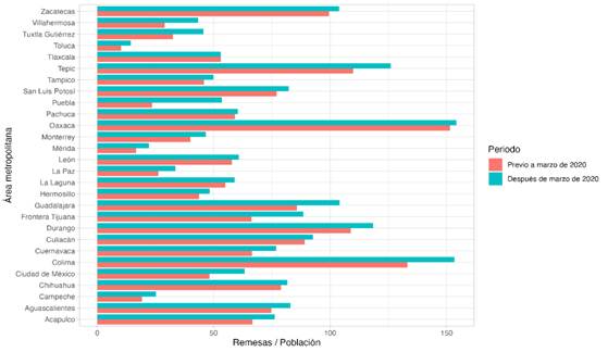 Para este análisis empleamos datos mensuales de remesas por municipio, reportados por Banxico de abril de 2019 a abril de 2021. Los datos abarcan un periodo de dos años dividido en partes equivalentes en las que se comparan las remesas en periodos previos y posteriores a las medidas y restricciones tomadas ante la crisis de covid-19. Seleccionamos este intervalo para hacer una comparación entre periodos equivalentes, donde los resultados observados no difieren significativamente al extender el periodo hasta noviembre de 2021, cuando se reabrieron las fronteras. Se registran las remesas a nivel municipal en 74 municipios que abarcan 23 áreas metropolitanas en México. La gráfica 2 muestra el comportamiento de las remesas en las áreas metropolitanas estudiadas, estimado en dólares por habitante de la zona metropolitana. El incremento más grande de remesas per cápita se dio en Colima, con 30.9 dólares, seguido de Tepic (18.8) y la frontera de Tijuana (17.5); los más pequeños fueron Toluca (1.0), La Laguna (1.1) y Chihuahua (3.5).