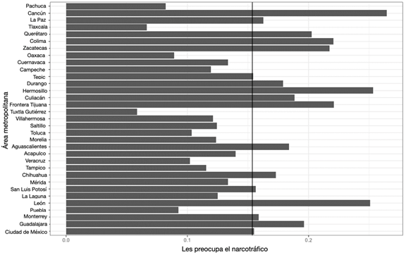 El indicador que usamos representa la proporción de personas en la zona metropolitana que señalaron al narcotráfico dentro de los tres problemas que más les preocupaban. La gráfica 3 muestra esta proporción en las diferentes áreas metropolitanas; la línea vertical indica el promedio general.