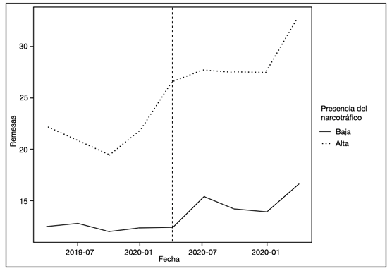 Para definir el nivel alto o bajo de presencia de narcotráfico se tomó como frontera una desviación estándar arriba de la media en el indicador. Esta división generó 126 observaciones para el grupo de áreas metropolitanas con un nivel alto de presencia de grupos criminales y 882 para las de baja presencia. El comportamiento de las remesas en el periodo se puede observar en la gráfica 4. La línea vertical se encuentra en abril de 2020, que corresponde a un cambio en la tendencia de ambos grupos.