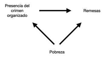 El grafo acíclico dirigido (GAD) (Matsueda, 2012), representado en la figura 1, muestra la relación causal entre la presencia del crimen organizado y las remesas con una puerta trasera entre la pobreza y estas dos variables. De acuerdo con Ríos Contreras (2014), la presencia de violencia y extorsión en las comunidades tiene el efecto no planeado de forzar la migración de las personas afectadas, principalmente hacia Estados Unidos.