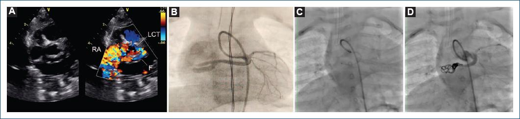 Figura 1 A: vista en el eje corto de grandes vasos en bidimensional y Doppler color mostrando dilatación de la arteria coronaria izquierda. B: angiografía previa en la que se aprecia el trayecto de la fístula. C: microcatéter en la porción distal de la fístula. D: angiografía de control mostrando la oclusión total de la fistula. F: fístula; LCT: tronco coronario izquierdo; RA: auricula derecha.
