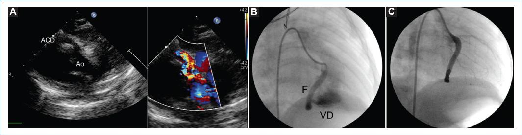 Figura 2 A: vista en el eje corto en bidimensional y Doppler color mostrando dilatación de la arteria coronaria derecha (ACD). B: angiografía en la que se aprecia una fístula coronaria derecha que llega al ventrículo derecho (VD). C: angiografía de control mostrando la oclusión completa distal de la fístula. AO: aorta; F: fístula.