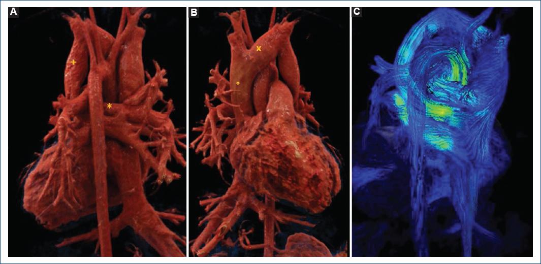 Figura 2 A: reconstrucción volumétrica, vista posterior, visualizando la confluencia de las venas pulmonares a colector común (*), con drenaje a vena vertical (+) y vena innominada (x). B: reconstrucción volumétrica, vista coronal, mostrando la confluencia de vena innominada a vena cava superior (°). C: valoración de la dinámica de flujos con secuencia de flujo 4D, evidenciando flujo laminar sin zonas de obstrucción.