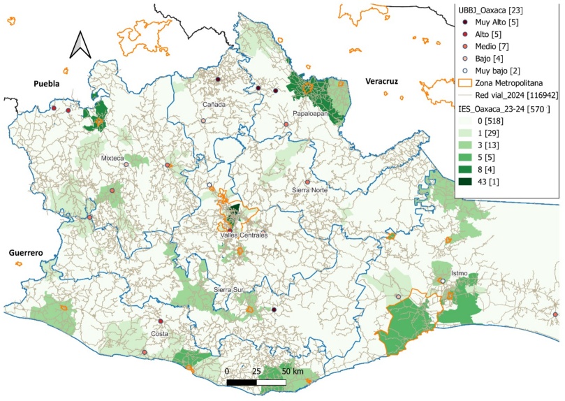 Es relevante destacar dos aspectos vinculados con la red vial. En primer lugar, las sedes de las UBBJ están situadas sobre o cerca de carreteras, lo que sugiere una instalación estratégica que no solo cubre zonas sin oferta educativa previa, sino que también garantiza accesibilidad territorial. En segundo lugar, observamos un notable incremento en la infraestructura carretera: mientras que en 2018 Oaxaca contaba con 61,488 kilómetros de vías, para el final del sexenio 2023-2024 esta cifra ascendió a 116,942 kilómetros, lo que representa un crecimiento del 190 %. Este aumento en las vías de comunicación tiene efectos directos sobre la GME, al facilitar el acceso tanto a servicios como a mercancías, incluida la educación superior.
