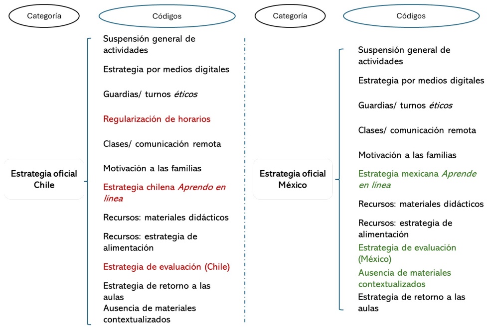La categoría “estrategia oficial” emergió del análisis y hace referencia a los lineamientos y acciones que, según el profesorado participante -y corroborado por las autoridades educativas-, cada país estableció para continuar proporcionando el servicio educativo en el marco de las medidas sanitarias de prevención, cuidado y aislamiento. Como podemos observar, algunos códigos no se repitieron en ambos países: en el caso de Chile aparecen señalados en color rojo, mientras que en México se registran en verde.