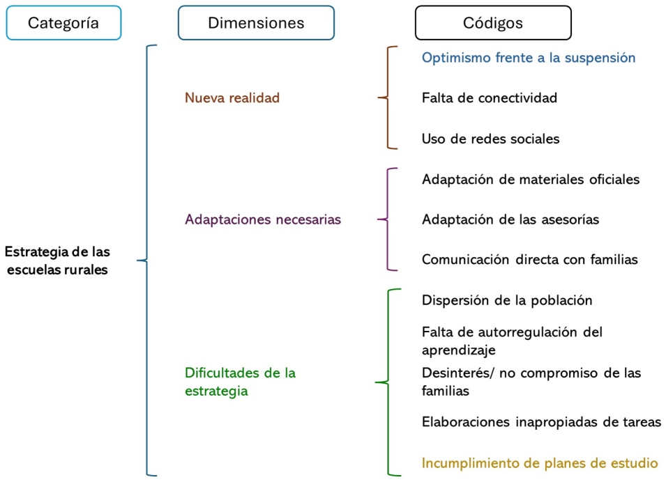 Figura 2 Cuadro sinóptico de las dimensiones y códigos de la categoría “estrategia de las escuelas rurales”.