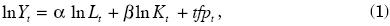 donde Yt, Lt, Kt y tfpt (total factor productivity) representan, respectivamente, el valor real del PIB, el nivel de empleo, el valor real del acervo de capital y el logaritmo de la productividad total de los factores (residuo de Solow), observados en el momento t.