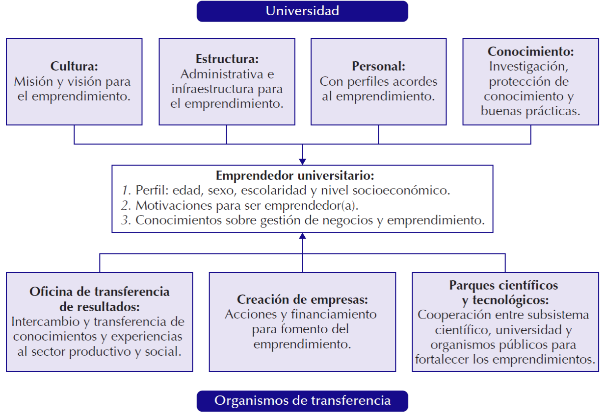 En cuanto a la universidad, su capacidad emprendedora depende de su cultura, estructura, personal, conocimiento y emprendedores universitarios. En relación con los mecanismos de transferencia, se estudian dos grupos: 1. Los internos que pertenecen a la universidad, tales como la oficina de transferencia de resultados de investigación o vinculación, los programas de creación de empresas, los viveros y los parques tecnológicos. 2. Los externos, formados por organismos e instituciones que fomentan el emprendimiento y la inversión. En una universidad emprendedora la cultura de emprendimiento permea en toda la organización, es decir, no sólo es responsabilidad de los profesores de ciertas asignaturas, es parte medular de su misión y, de manera colaborativa, todos los actores escolares trabajan para fomentar el emprendimiento (Kirby, 2006; Vásquez, 2017).