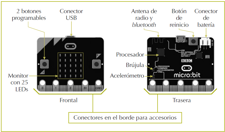 La tarjeta cuenta con diferentes componentes para su utilización, en este caso un monitor frontal de 25 Light Emitting Dio-de (LED), dos botones, diecinueve terminales de entrada-salida, acelerómetro, compás, radio, sensor de luz, sensor de temperatura, vinculación vía bluetooth y una interfaz Universal Serial Bus (USB) para su programación, así como para el envío y recepción de datos entre el dispositivo y un equipo de cómputo (Monk, 2018). La programación del dispositivo se hace mediante un entorno de desarrollo disponible en la Internet llamado MakeCode Editor, el cual permite la programación del dispositivo mediante bloques, o bien, mediante código en JavaScript. Además, existe una versión de Python para la programación del dispositivo si se requiere utilizar características más avanzadas sobre el lenguaje de programación o por si ya se tiene conocimiento de este lenguaje.