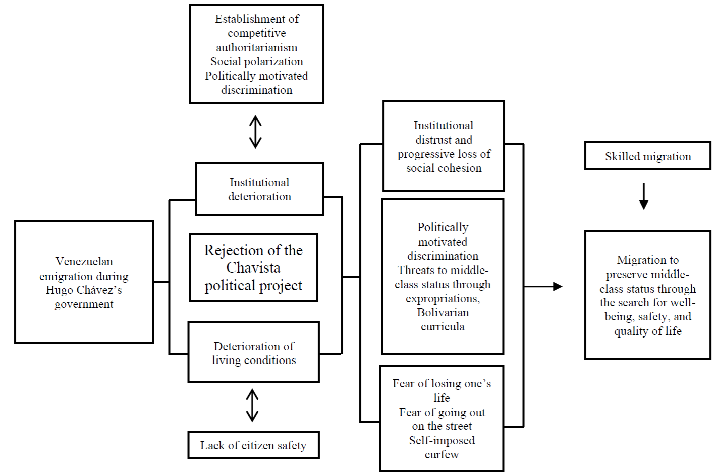 | Factors that influence the decision to emigrate | Insecurity, expropriations, rejection of the Chavista political project | Deterioration of both institutions and material conditions of living |