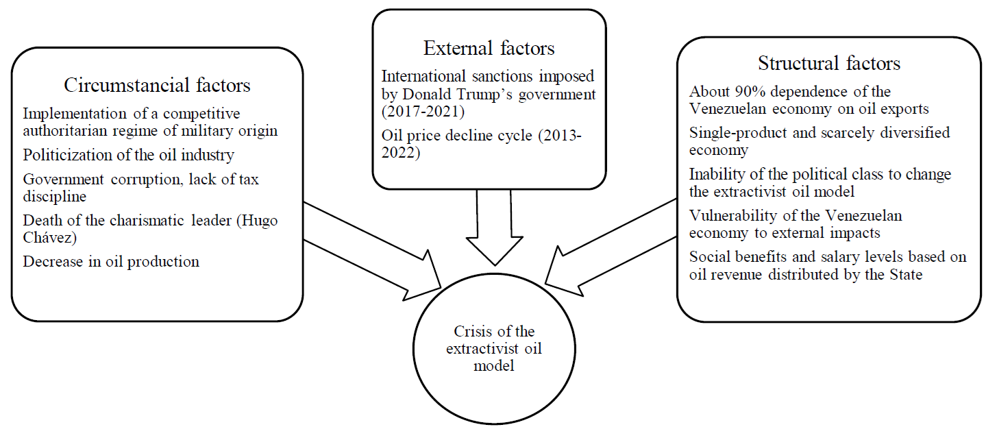 Among the conjunctural factors that led to the crisis of the extractivist model, international sanctions against the Venezuelan economy, an abrupt fall in oil production from 3.2 million barrels per day in 1998 to 700 000 barrels per day in 2019, and a new cycle of low oil prices that extended to the war in Ukraine stand out (OPEC, 2019; Pérez, 2014). All of this taking place within a political context marked by the militarization of public administration, by corruption, and by the deinstitutionalization caused by the establishment of a competitive authoritarian regime (Levitsky & Way, 2004).