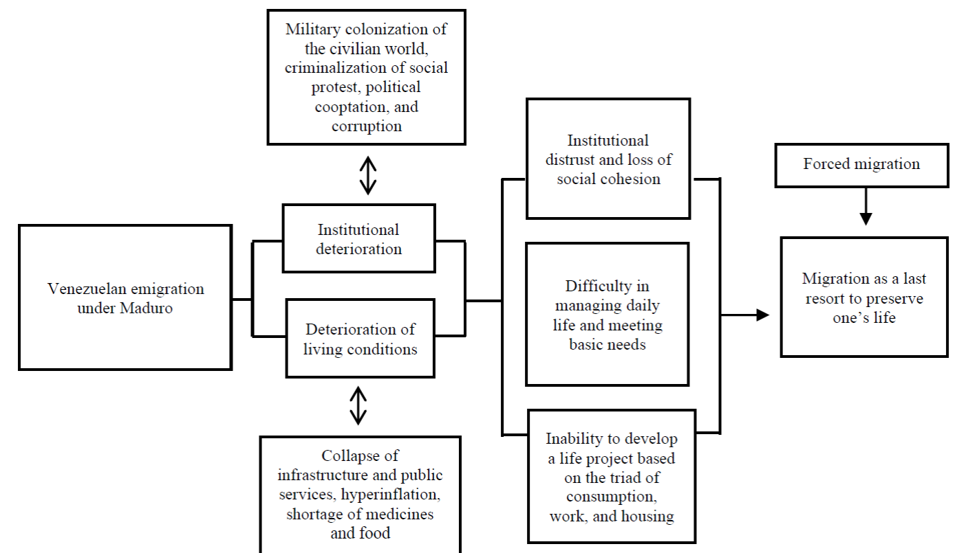 Therefore, forced migration, the current socio-political crisis, and their relationship with the extractivist model serve as an argument to understand how in Venezuela under Maduro, more than seven million people (UNHCR, 2021) made the decision to emigrate “within the constrictive framework of a set of structural factors that offer people only a restricted range of options for their personal and family survival” (Parella, 2022, p. 42).
