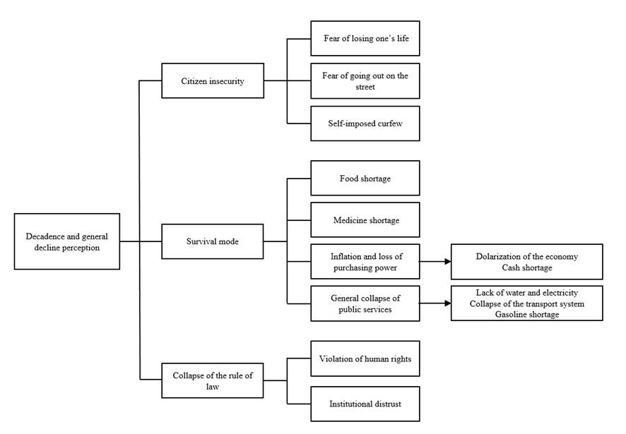 The Decadence and general decline code network was built through the perception that the interviewees had about government management during the term of Nicolás Maduro. This network is extremely relevant to the present research, as it allowed to address, from the concept of forced migration and the extractivist oil model, the structural causes that triggered Venezuelan migration to Chile in the 2017-2020 period, as well as asking oneself how the second collapse of the extractivist model affected people’s lives.