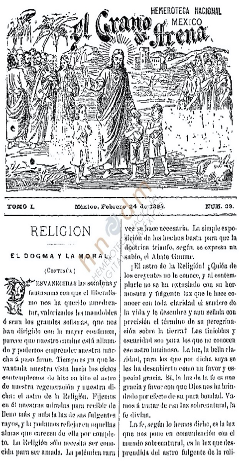 Sobre este mismo tema, pero en una dirección contraria, en El Grano de Arena del 24 de febrero de 1895 se publicó el artículo “Religión. El dogma y la moral” (véase la Imagen 1), en el que, de manera similar, se hace una crítica de las ideas de los liberales más extremistas exponiendo que su discurso está plagado de sofismas que tienen como función menoscabar la labor de la religión dentro de la sociedad, por lo cual hacen una defensa de esta institución como si fuera una derivada de la voluntad directa de Dios.