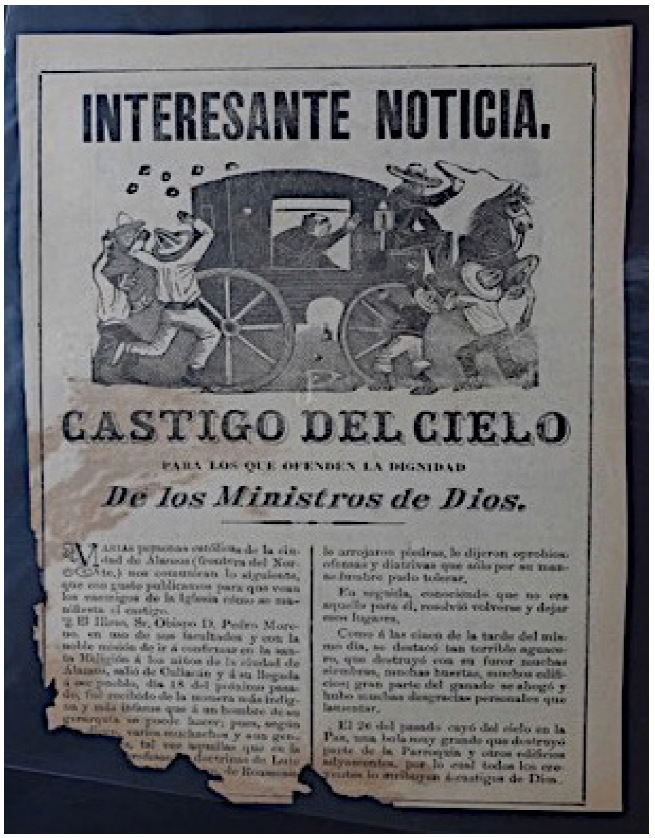 Por su lado, en el pliego de cordel y las hojas volantes encontramos situaciones parecidas, pero vistas desde el ámbito de la tradición oral, los exempla y la rica mitología del cristianismo medieval, como se aprecia en estos ejemplos, en los que Dios castiga de manera inmediata y ciertamente brutal a todos aquellos que se oponen a su Iglesia y a sus ministros, ya no de manera velada y sutil, como se aprecia en los textos de la prensa convencional que apelan a un discurso teológico un tanto simplificado.
