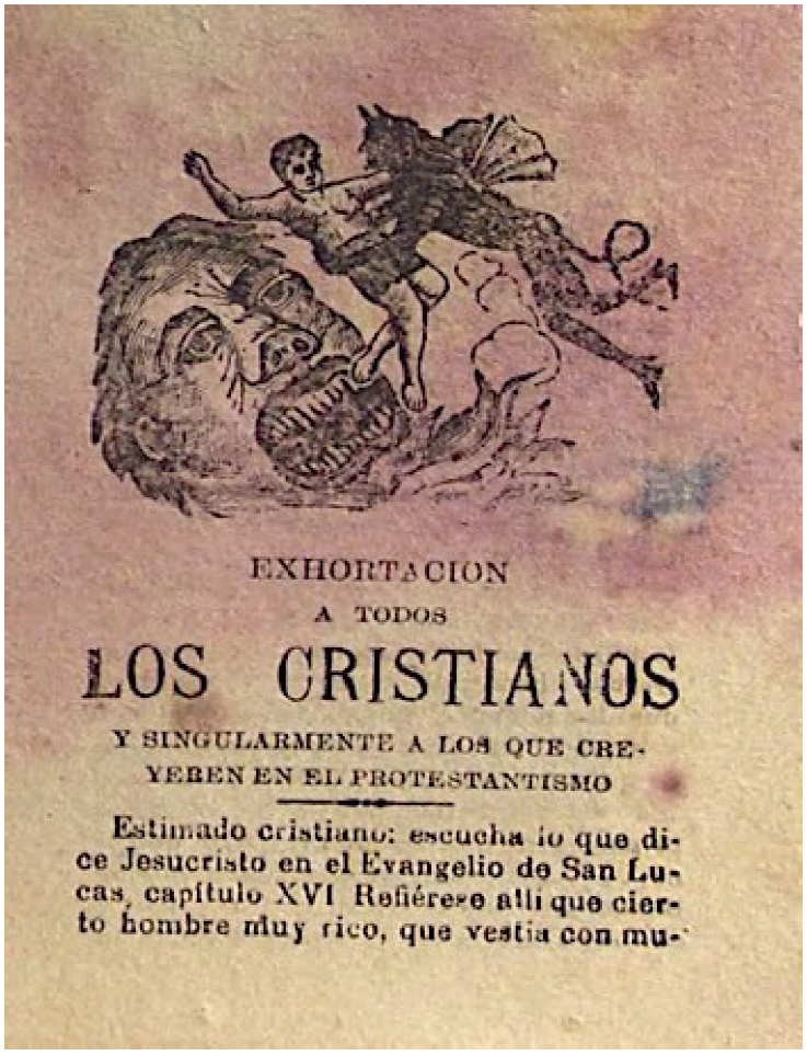 Un ejemplo más que, aunque se sale de nuestra temporalidad, es parte de este discurso a favor del catolicismo en contra de todo tipo de enemigos lo tenemos en el ítem con título “Exhortación a todos los cristianos y singularmente a los que creyeren en el protestantismo” (véase la Imagen 3). Esta hoja doblada deja ver cómo persistió el discurso antiprotestante aún después del porfiriato y, al mismo tiempo, nos da indicios de una lucha silenciosa entre credos, ya que se seguía pensando que el protestantismo, religión que estaba ganando adeptos en suelo mexicano, con mayor ahínco durante la segunda parte del siglo XIX, era una fe inspirada en el diablo, una tendencia que era cotidiana en el pensamiento religioso católico mexicano. Recordemos que en las primeras décadas del México independiente se tenía a la religión católica como la única fe oficial de la nación, por lo que se buscó mantener a raya la entrada de otros credos a este país.
