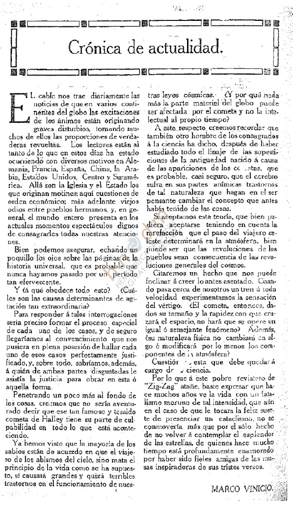 Finalmente, otro tipo de documentos nos muestran lo complejo que podía llegar a ser este miedo, al concatenar sucesos del ámbito internacional con la seguidilla de desastres y clima de laicización que se estaba viviendo en Occidente. Esto lo podemos identificar en el semanario regiomontano Zig-Zag. Semanario Ilustrado de Ciencias, Artes, Literatura y Actualidades del 24 de abril de 1910, que en su “Crónica de actualidad” (HNDM, 1910, abril 24) (véase la Imagen 4) registra el pesar del editor de este número, ya que muestra mucha preocupación por los acontecimientos de su presente: desde las pugnas cada vez mayores entre países e imperios y la vinculación de estas con acontecimientos como el paso del cometa Halley. De manera hiperbólica, menciona que posiblemente es la etapa más efervescente de la historia de la humanidad, ya que Estados poderosos e Iglesias estaban generando la antipatía entre las naciones. Explica que si Dios no mata a su creación de manera directa, como castigo por su comportamiento belicoso, sí que lo hará de modo indirecto con la ayuda de los cometas y su influencia maligna.