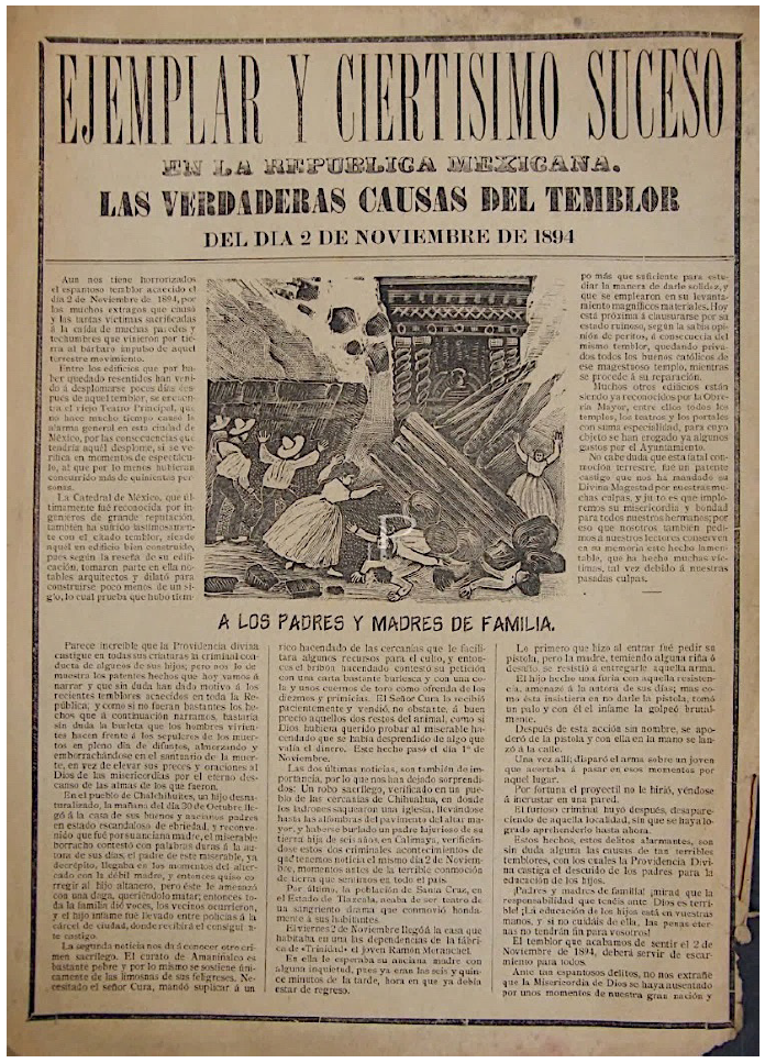 El primer impreso con estas características que circuló por las calles de la ciudad de México es el de la “Narración del terremoto de Guatemala” (1541) (Fernández, 2010, pp. 70-71), artefacto cultural que por su tema y programa de exposición gráfica con una ilustración en el registro superior y un texto breve en la parte inferior nos ofrece indicios acerca de la manera en que este tema tan aterrador siempre ha sido vinculado a las manifestaciones de poder por parte de Dios, al menos en este tipo de material impreso, apareciendo, sin embargo, hoy en día en otros medios masivos como las redes sociales de internet. Aunque hoy se sabe que este impreso no era necesariamente novohispano, lo cierto es que fue uno que gozó de amplia difusión en estas tierras (Rodríguez, 2016, pp. 363-370), probablemente por su contenido tan explicativo sobre esta clase de siniestros desde el punto de vista del cristianismo católico.