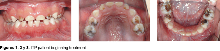 The patient was referred to the Stomatology Service due to the fact that she presented pain and swelling in tooth number 74. Upon clinical examination, the patient did not show or inform of bleeding, petechiae or ecchymoses. Intraorally, the patient presented full primary dentition with numerous caries of varied severity (Figures 1 to 3). Tooth number 74 showed extensive caries with apparent communication to the pulp. There was an increased volume in the marginal gingival tissue, and insertion, approximately 1 cm in diameter. Upon palpation there was egress of painful and purulent matter. There was a 3 mm mobility in vestibular-lingual direction. Tooth number 8 presented extensive caries, and was painful to horizontal and vertical percussion. Teeth numbers 55, 54, 64, 65, 75 and 85, presented extensive caries as well as fistulae. Teeth number 52 and 62 presented caries on the palatine and vestibular faces. Tooth number 51 presented caries at the palatine face. Teeth 31 and 41 were erupting, with persistence of primary teeth 71, 81. The rest of the teeth showed no alterations. Hematic cytometry revealed a 183,000 mm3 platelet count.