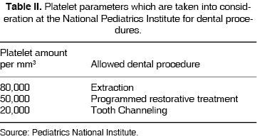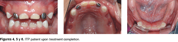 Sánchez12 and Farfán13 mention that a clinical picture of purpura manifests itself with a platelet count of 50,000/mm3 or less. The patient presented epistaxis and petechiae with platelet count of 133,000/mm3. In this case the condition remitted spontaneously, without any treatment. Attention protocols2,5 indicate that the minimum platelet count for dental treatment must be 50,000/mm3 and 100,000/mm3 for minor surgical procedures (extractions). The patient presented a platelet count of 183,000/mm3. For this reason she was treated as a healthy patient. Nevertheless some additional precautions were taken1-5 such as anesthesia in one episode, placement of Gelfoam® at the extraction site, application of suture points, as well as maintained pressure. These patients present predisposition to suffer haemorrhage18-19 when submitted to dental extractions or prophylaxis. Piot16 recommends the use of fibrin gum, desmopressin and antifibrinolytic agents such as tramexamic acid, Chamate20 and Finucane.17 Where there is presence of trauma in the oral cavity and the patient in need of dental treatment shows a platelet count lesser than 30,000/mm3, it is advised after consultation with the hematologist, to administer immunoglobulins to increase platelet count. Some patients are refractory to treatment. They receive immunosuppressive drugs.21 Splenectomy is considered a last resort, in these patients it is necessary to employ antibiotic prophylaxis.21-23