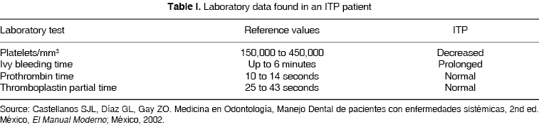 Key words: Idiopathic thrombocytopenic purpura (ITP), gingivorragia (bleeding gums), petechiae, ecchymosis.