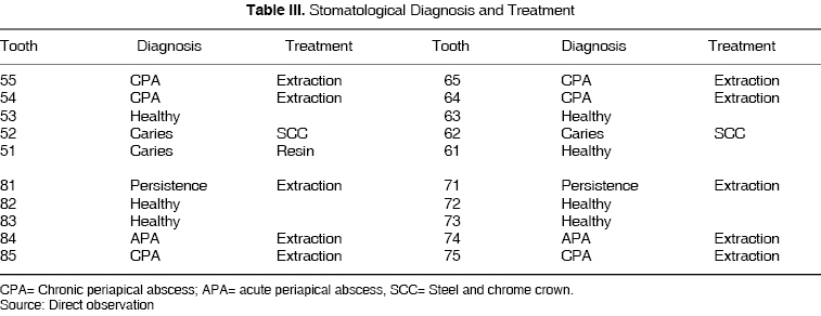 Stomatological treatment consisted of 10 extractions, 2 steel-chrome crowns and 1 resin (Table III).