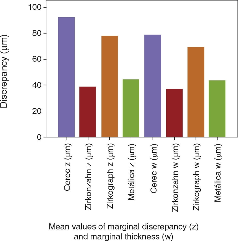 Mean absolute marginal discrepancy and mean marginal thickness were 92.14 ± 38.59 and 78.62 ± 31.33 μm for CAD/Cam Cerec InLab (Sirona®) system; 38.71 ± 12.62 and 36.91 ± 13.56 μm for CAD/CAM Zirkonzahn (Zirkonzahn®); 77.92 ± 38.01 and 69.42 ± 33.23 μm for pantographic system Zirkograph 025 ECO (Zirkonzahn®) and 44.11 ± 15.36 and 43.74 ± 15.70 μm for the metallic copings control group (Figure 4). The CAD/CAM Zirkonzahn group (Zirkonzahn®) presented lower values of absolute mean marginal discrepancy and mean marginal thickness; it was followed by the control group of metallic copings, with an error in standard deviations lesser than 5% (3.17%). The group with greater mean marginal discrepancy (vertical, horizontal and absolute) and mean marginal thickness was Cerec InLab (Sirona®) (Figure 5). With t test, statistically significant differences were recorded at the absolute marginal discrepancy (y) and marginal thickness (w) between groups Cerec InLab (Sirona®) and Zirkograph 025 ECO (Zirkonzahn®), in comparison with the control group of metallic copings (p = 0.0009) (p < 0.001). No statistically significant results were observed between CAD/CAM groups Zirkonzahn (Zirkonzahn®) and control group (p > 0.001).