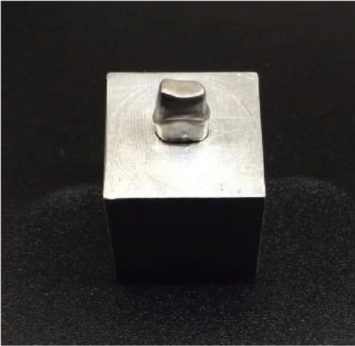 An in vitro explicative, experimental and comparative study was conducted. A Cr-Co master model was fabricated, based on an ivorine preparation for zirconia crown of an upper premolar. Proximal shaping consisted on a 1 mm lingual and vestibular proximal reduction, and 1.5 mm in occlusal direction, with a rounded-shoulder gingival margin. This same carving was replicated in a Cr-Co master model, with aluminum based cubic design supporting structure (Figure 1). All samples were manufactured on that model.