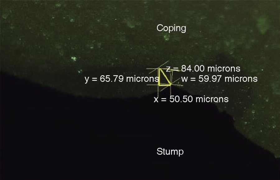 One point per side in each coping was analyzed at marginal level. Marginal width (w) was measured in microns, and absolute marginal discrepancy was determined (z). To this effect, the method standardized by Holmes et al13 was used: this method measures horizontal (x) and vertical (y) marginal discrepancy. Measurements photographs were taken with Infinity 1 software (Lumera®) (Figure 3). Said photographs were approved by Dr. Fernando Sandoval, Dean of the School of Dentistry, University San Francisco de Quito. Statistical analysis was conducted with SPSS IBM® software. Obtained data and significance were executed with t test.