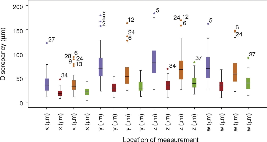 Figure 4 Box plot representing distribution of horizontal (x), vertical (y) absolute (z) and marginal thickness (w) dimensions obtained in all analyzed systems.