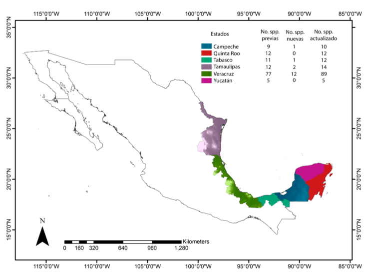 Distribución: Campeche, Hidalgo, Oaxaca, Quintana Roo, San Luis Potosí, Tabasco, Tamaulipas, Veracruz y Yucatán.