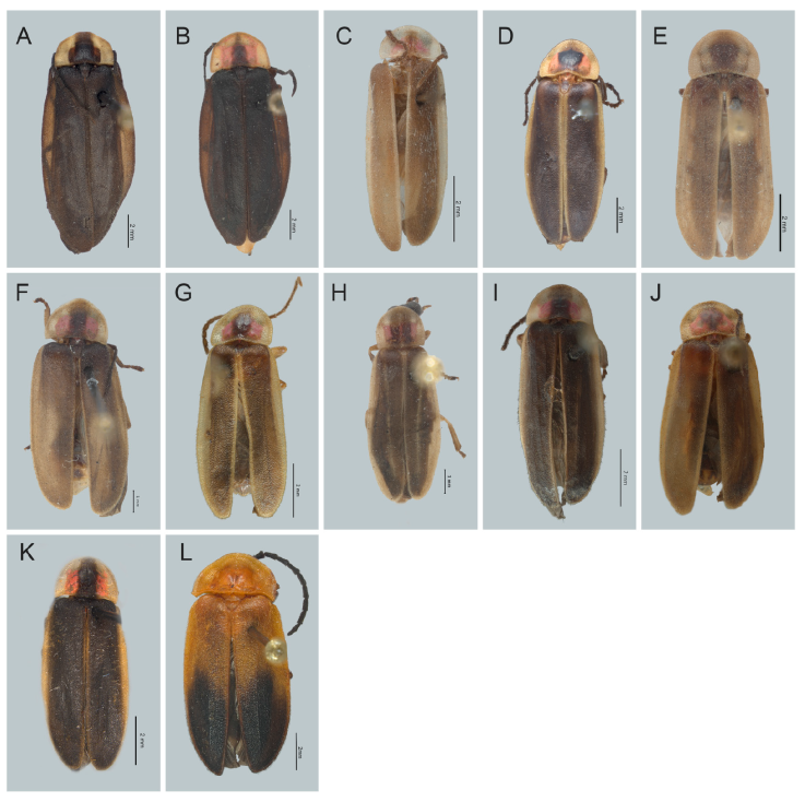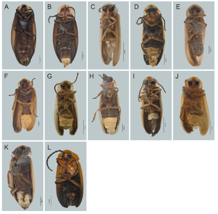 Figura 11 Vista ventral de especies de Photinus. A) Photinus perotensis, B) P. phalloentis, C) P. plumbeus, D) P. poncianoae, E) P. pulchellus, F) P. reichei, G) P. staku, H) P. tenuilineatus, I) P. vezlirai, J) P. xochiquetzalae, K) P. xonamancae, L) Lucidota discolor.