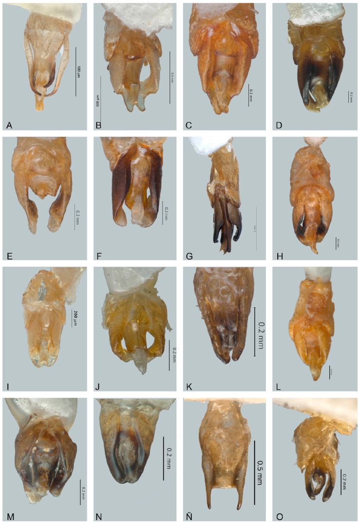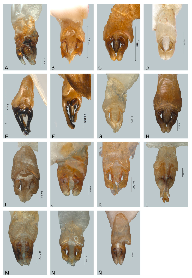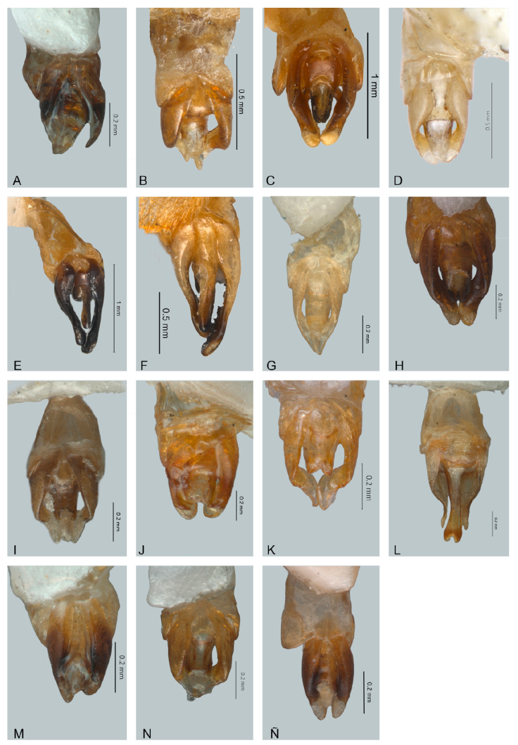 Figura 12 Vista dorsal de edeagos de Photinus. A)Photinus mictlantecuhtli, B) P. noguerai, C) P. paracongruus, D) P. perezi, E) P. perotensis, F) P. phalloentis, G) P. plumbeus, H) P. poncianoae, I) P. pulchellus, J) P. reichei, K) P. staku, L) P. tenuilineatus, M) P. vezlirai, N) P. xochiquetzalae, Ñ) P. xonamancae.
