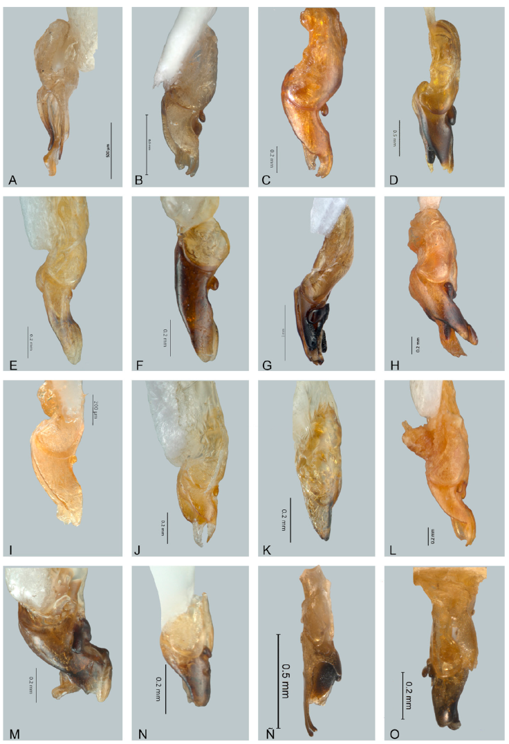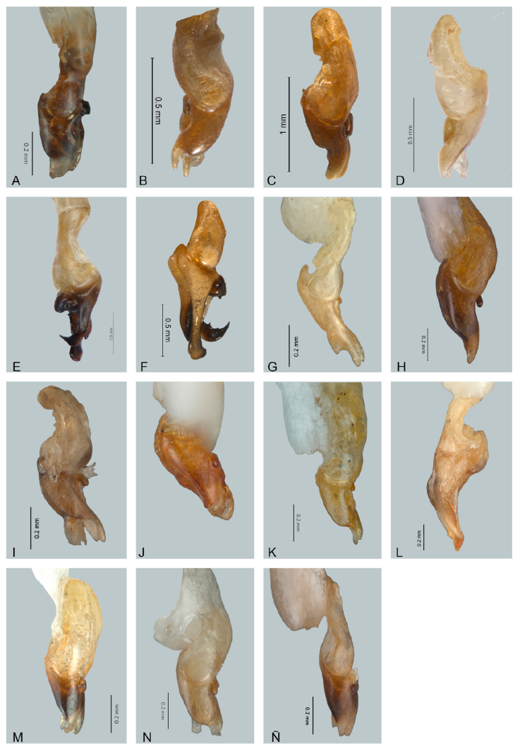 Figura 14 Vista lateral de edeagos de Photinus. A) Photinus mictlantecuhtli, B) P. noguerai, C) P. paracongruus, D) P. perezi, E) P. perotensis, F) P. phalloentis, G) P. plumbeus, H) P. poncianoae, I) P. pulchellus, J) P. reichei, K) P. staku, L) P. tenuilineatus, M) P. vezlirai, N) P. xochiquetzalae, Ñ) P. xonamancae.
