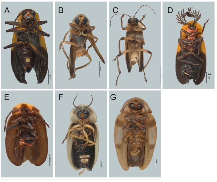 Figura 4 Vista ventral de especies de Lampyridae. A) Bicellonycha crassa, B) Photuris mollis, C) P. trivittata, D) Phaenolis ustulata, E) Tenaspis gonzalenzis, F) Cratomorphus picipennis, G) Aspisoma quasidiaphana.